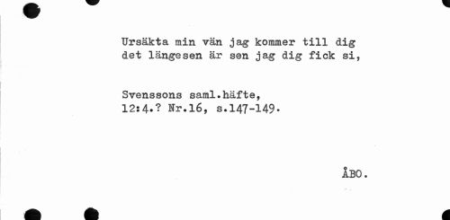 //// Ursäkta min vän jag kommer till dig det längesen är sen jag dig fick si, //// Svenssons saml.häfte, //// 12:4*? Nr.16, s.147-149• //// ÅBO. //// .-t. ////