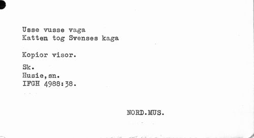 //// w //// Usse vusse vaga Katten tog Svenses kaga //// Kopior visor. Sk. //// Husie,sn. IFGH 4988:38. //// HOED.MUS. //// , > A ////