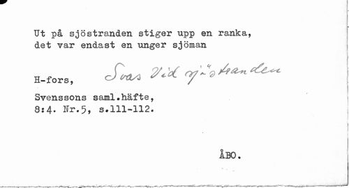 //// Ut på sjöstranden stiger upp en ranka, det var endast en unger sjöman //// H-fors, cf«M //// > //// Svenssons saml.häfte, i //// 8:4. Nr.5, s#lll-112. i //// 1 //// ÅBO. //// .n ////