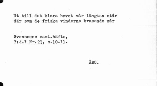 //// . //// Ut till det klara havet vår längtan står där som de friska vindarna brusande går //// ! //// Svenssons saml.häfte, 7:4.? Nr.23, s.10-11. //// ÅBO. //// k ////