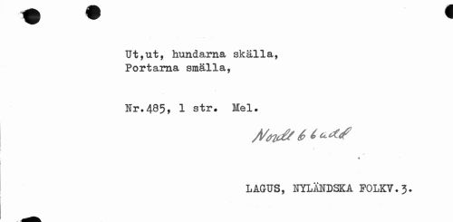 //// w 9 //// Ut,ut, hundarna skälla, Portama smälla, //// Hr,485, 1 str* Mel. //// i //// % //// • i • 4 //// LAGtJS, ETYLÅlfDSKA FOLKV. 3. ////