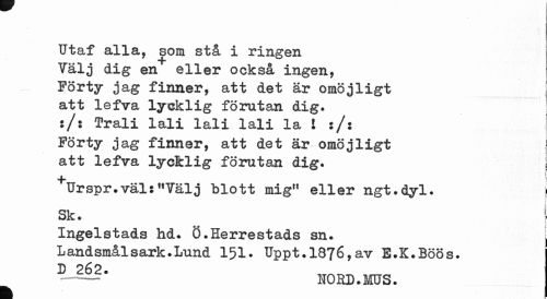 //// Utaf alla, som stå i ringen Välj dig en eller också ingen, Förty jag finner, att det är omöjligt att lefva lycklig förutan dig. :/: Trali lali lali lali la t :/: //// Förty jag finner, att det är omöjligt j //// - //// att lefva lycklig förutan dig. j //// 4- ! //// Urspr.välstrVälj blott mig" eller ngt.dyl. \ //// l //// Sk. //// Ingelstads hd. Ö.Herrestads sn. j //// Landsmålsark.Lund 151* Uppt.l876,av E.K.Böös. //// ——# NORD. MUS. //// t ////
