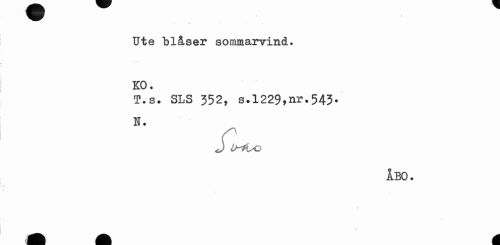 //// Ute blåser sommarvind. KO. //// T.s. SLS 352, s.1229,nr.543. H. //// SUo //// ÅBO. //// « ////