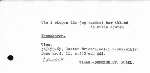 //// Ute i skogen där jag vandrat har ibland //// de vilda djuren //// Skomakaren. Ulma. //// 347:59-65* Gustaf Ericson,mel.i H.mus.arkiv. //// Dans nr.4> II > s.452 och 444. //// ^ TILLH. -DMCKER, SY. FGLKL. ////