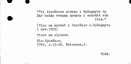 //// "Uti Bjuråkers socken i Spångmyra by ^^ Där bodde tvänne syskon i endräkt och //// W frid." //// (Yisa om mordet i Bjuråker o.Spångmyra //// i nov.1905) //// Yisor om olyckor. Hls.Bjuråker, //// 7782, s.23-26, Ericsson,J. //// ULMÅ. ////