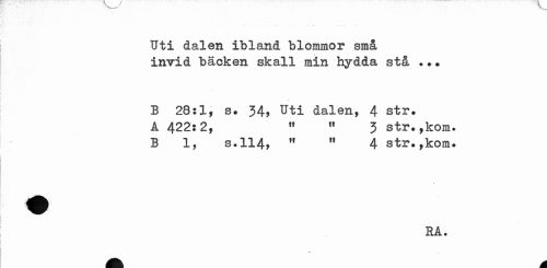 //// Uti dalen ibland blommor små //// invid bäcken skall min hydda stå ... //// B 28:1, s. 34, Uti dalen, 4 str. //// A 422:2, H rf 3 str.,kom. //// B 1, s.114, 11 " 4 str.,kom. //// RA. //// ? ////