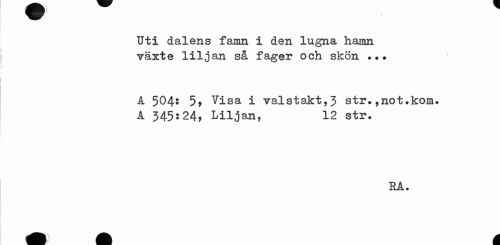//// Uti dalens famn i den lugna hamn växte liljan så fager och skön ... //// A 5045 5> Visa i valstakt,3 str.,not.kom. A 345:24, Liljan, 12 str. //// RA. ////