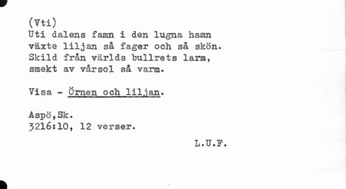 //// (vti) //// Uti dalens famn i den lugna hamn växte liljan så fager och så skön. Skild från världs "bullrets larm, smekt av vårsol så varm. //// Visa - Örnen och liljan. //// Åspö,Sk. //// 3216:10, 12 verser. //// L.U.F. //// k ////