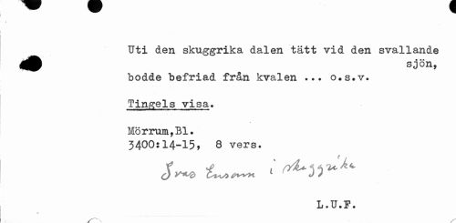 //// 4 //// Uti den skuggrika dalen tätt vid den svallande bodde befriad från kvalen ... o.s.v. Tingels visa* Mörrum,Bl. //// 3400:14-15, 8 vers. //// f //// L.U.F. ////