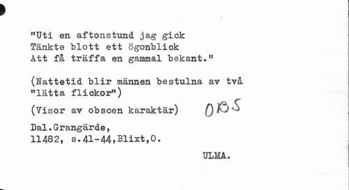 //// I //// t //// "Uti en aftonstund jag gick Tänkte blott ett ögonblick Att få träffa en gammal bekant." //// (Nattetid blir männen bestulna av två "lätta flickor") //// (Visor av obscen karaktär) Q ^ //// Dal.Grangärde, 11482, s.41-44,Blixt,0. //// ULMA. ////