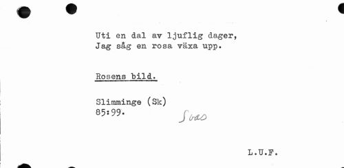 //// * //// Uti en dal av ljuflig dager, Jag såg en rosa växa upp. //// Rosens bild. Slimminge (Sk) //// 85S"- J(nU> //// L.U.P. ////