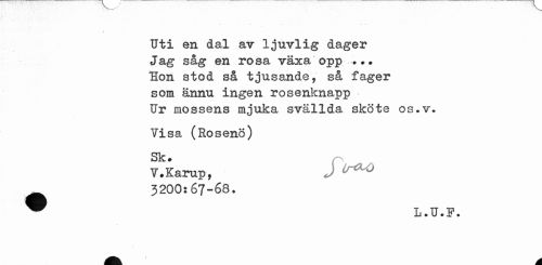 //// » //// Uti en dal av ljuvlig dager Jag såg en rosa växa opp... Hon stod så tjusande, så fager som ännu ingen rosenknapp Ur mossens mjuka svällda sköte os.v. //// Visa (Rosenö) //// Sk. //// Y.Karup, J lr€L° //// 3200:67-68. //// ^ L.U.F. ////