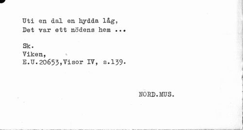 //// Uti en dal en hydda låg, //// i //// Det Tar ett nödens hem . ?? //// Sk. //// Viken, //// E.U.20653*Visor iv, s.139- ' //// ( //// ... j //// ! //// HORD.MUS. ////