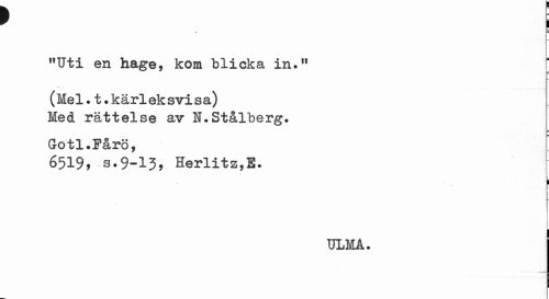 //// ' i //// "Uti en hage, kom blicka in." (Mel. //// t.kärleksvisa) L //// Med rättelse av N.Stålberg. //// Gotl.Fårö, //// 6519, s.9-13, Herlitz,E. //// 1 //// ULMA. ////
