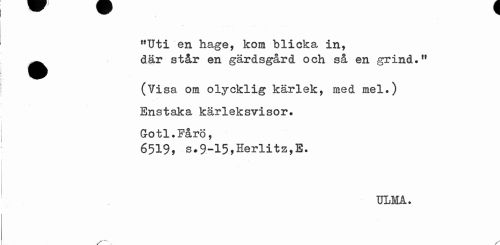 //// r,TJti en hage, kom blicka in, ^^ där står en gärdsgård och så en grind.11 //// (Visa om olycklig kärlek, med mel.) //// Enstaka kärleksvisor. //// Gotl.Fårö, //// 6519, s.9.-15fHerlitz,E. //// ulmå. //// /** ¦ / ////