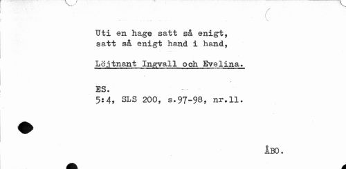 //// c //// ... . .. . v. //// Uti en hage satt så enigt, satt så enigt hand i hand, //// Löjtnant In^vall och Evelina. //// * //// ES. //// 5:4, SLS 200, s.97-98, nr.11. //// ÅBO. ////