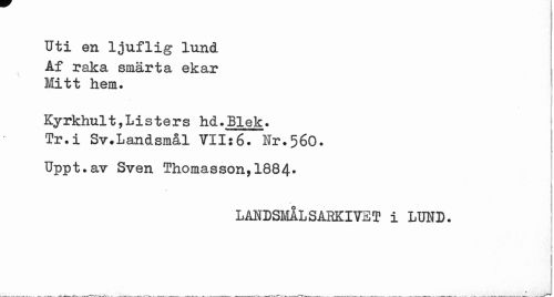//// Uti en ljuflig lund //// Af raka smärta ekar Mitt hem. //// Kyrkhult,Listers hd.Blek. Tr.i Sv.Landsmål 711:6. Nr.560. //// Uppt.av Sven Thomasson,1884* //// t //// LMDSMÅLSABKIVET i LUND. ////