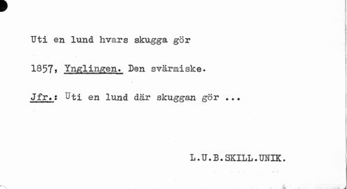 //// Uti en lund hvars skugga gör 1857, Ynglingen» Den svärmiske. //// i //// Jfr,t Uti en lund där skuggan gör ... //// L.U.B. SKILL.UIIIK. ////