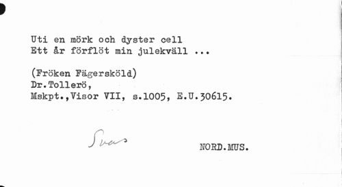 //// r //// Uti en mörk och dyster cell Ett år förflöt min julekväll //// i //// (Fröken Fägersköld) ! //// Dr.Tollerö, //// Mskpt»,Visor VII, s.1005, E.U.30615. //// 1 1 //// .. - - //// FORD.MUS. //// '« i //// - .. ... ... -... . ___ I ////