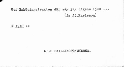 //// j //// Uti Enköpings trakt en där såg jag dagens ljus ... //// (Av Ad.Karlsson) //// E 1910 22 //// i //// KBsS SKILLINGTRYCKSREG. //// j //// i //// • - ////