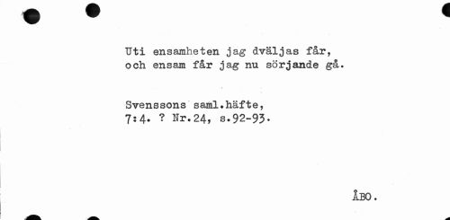 //// Uti ensamheten jag dväljas får, //// och ensam får jag nu sörjande gå. //// * •» //// Svenssons saml.häfte, //// 7:4. ? Nr.24, s.92-93. //// ÅBO. ////