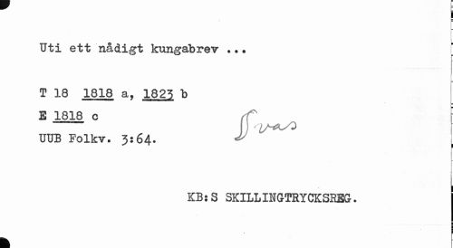 //// L //// Uti ett nådigt kungabrev ... ' //// T 18 1818 a, 1825 b //// m //// E 1818 c I //// --i i/^fuO //// UUB Folkv. 5:64. ^ L //// i-1 //// KBsS SKILLINGTRYCKSEEG. //// I //// I //// 3 //// t ////