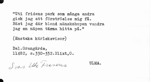 //// "Uti fridens park som många andra gick jag att förströelse mig få. Bäst jag där bland mänskohopen vandra jag en näpen tärna hitta på." //// (Enstaka kärleksvisor) //// Dal.Gr&ngärde, //// 11482, s.330-332.Blixt,0. //// k ////