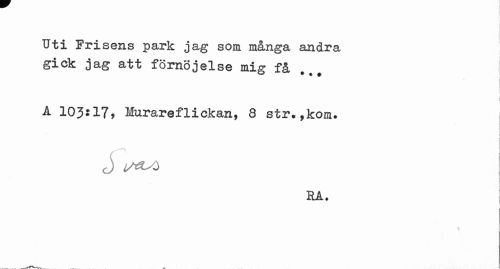 //// 1 //// Uti Frisens park jag som många andra giek jag att förnöjelse mig få ... //// i I //// A 103:1?) Murareflickan, 8 str.,kom* //// j //// o> j //// RA. ; //// St- ////