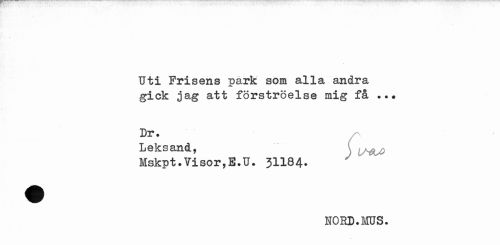 //// Uti Frisens park som alla andra gick jag att förströelse mig få . //// Dr, //// Leksand, ( //// Mskpt. ?i so r, E. U. 3118 4. //// NORD.MUS. ////