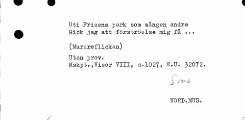 //// Uti Prisens park som mången andra ^^ Gick jag att förströelse mig få ... //// (Murare fIi ekan) Utan prov. //// MskptVisor VIII, s.1027, E.U. 32072. //// j //// WORD.MUS. //// s ////