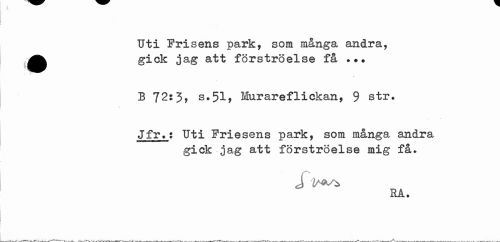 //// Uti Frisens park, som många andra, //// *gick jag att förströelse få .#? //// B 72:3, s»51, Murareflickan, 9 str. //// *x //// Jfr.: Uti Friesens park, som många andra //// gick jag att förströelse mig få. //// J //// RÅ. ////