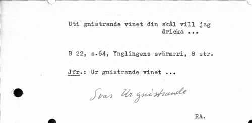 //// Uti gnistrande vinet din skål vill jag //// dricka ??• //// B 22, s»64, Ynglingens svärmeri, 8 str# //// Jfr •: Ur gnistrande vinet •.• //// / //// RA. //// ^^ * ////