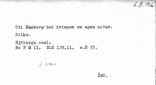 //// I l //// Uti Hamburg har kvinnan en egen natur. Polka. //// Sjöbergs saml. //// Ho P M 11, SLS 129,11, s.D 37- //// O //// ) ihiuo //// ÅBO. ////