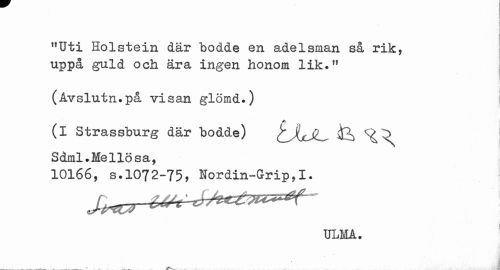//// "Uti Holstein där bodde en adelsman så rik, uppå guld och ära ingen honom lik." //// (Avslutn.på visan glömd.) //// /y //// (i Strassburg där bodde) ^JUjL, \ //// Sdml.Mellösa, //// 10166, s.1072-75, Nordin-Grip,I. //// ¦ 1 //// ULMA. ////