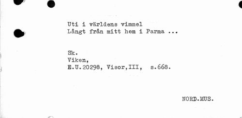 //// Uti i världens vimmel //// Långt från mitt hem i Parma ... //// Sk. //// Viken, //// E.U.20298, Visor,III, s.668. //// NORD.MUS. ////