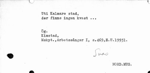 //// Uti Kalmare stad, //// der finns ingen kvast . ?. //// * //// Ög. //// Kimstad, //// Mskpt., Arbets sånger I, s.469,E.IT.19931. //// a J V-fi^O //// NORD. MS. //// A a ////