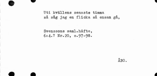 //// Uti kvällens senaste timma så såg jag en flicka så ensam gå, //// Svenssons saml.häfte, 6:4-? Nr.20, s.97-98» //// ÅBO. ////