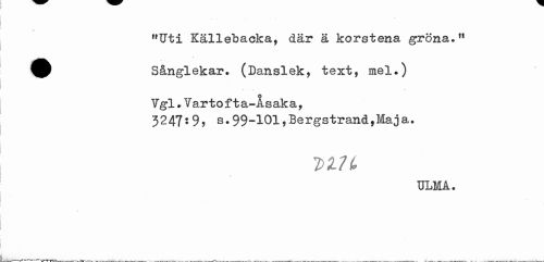 //// "Uti Källebacka, där ä korstena gröna." //// Sånglekar. (Danslek, text, mel.) //// Ygl.Vartofta-Åsaka, //// 3247:9, s.99-101,Bergstrand,Maja. //// D1H //// ULM A. ////