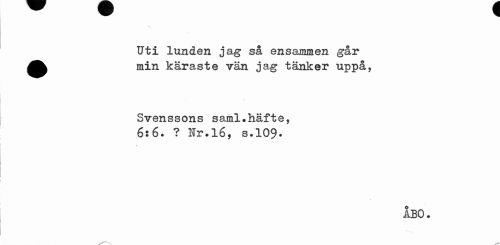 //// Uti lunden jag så ensammen går min käraste vän jag tänker uppå, //// Svenssons saml.häfte, //// 6:6. ? Nr.16, s.109* //// åbo. ////