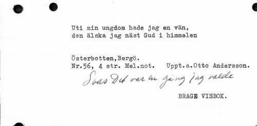 //// Uti min ungdom hade jag en vän, den älska jag näst Gud i himmelen //// Österbotten,Bergö. //// Hr.56, 4 str. Mel.not. Uppt.a.Otto Andersson. //// BRAGE VISBOK. //// — 1 1 //// jfl ^ i ////