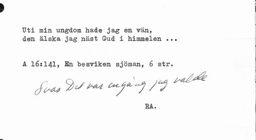 //// f //// Uti min ungdom hade jag en vän, den älska jag näst Gud i himmelen ... //// A 16:141, En besviken sjöman, 6 str. //// RA. ////