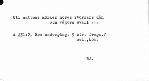 //// Uti nattens mörker höres stormars dån //// och vågors svall ... //// A 431:2, Bex undergång, 9 str* fragm.? //// mel.,kom. //// SA. //// i i //// l ////
