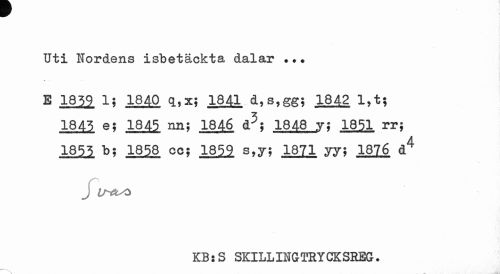//// Uti lordens isbetäckta dalar ... //// E 185? 1; 1840 1841 d,s,gg; 1842 l,t$ 1845 e; 1845 nn; 1846 d5? 1848 y; 1851 rr; 1855 b; 1858 cc; 1859 s,y; 1871 yy; 1876 d4 //// J ISrtsS //// KB: S SKILL ING TRY CK SREG. ////