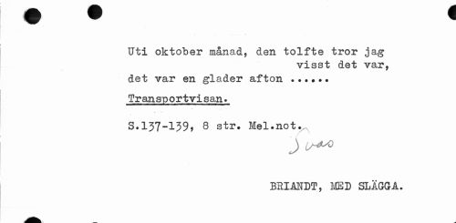 //// Uti oktober månad, den tolfte tror jag //// visst det var, det var en gläder afton ... //// Transportvi san * S.137-139, 8 str. Mel.not. //// J //// BBIAHDT, MED SLAGGA. ////