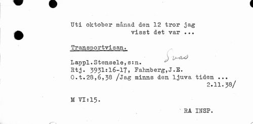 //// Uti oktober månad den 12 tror jag ^^ visst det var ... //// Transportvisan. //// ) y^eu) //// Lappl.Stensele, s:n. //// Rtj. 3931:16-17, Fahnberg,J.E. //// 0.t.28,6,38 /Jag minns den ljuva tiden ... //// 2.11.38/ //// M TI:15. //// ' RA INSP. ////