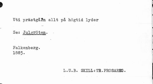 //// f I //// ¦ //// Uti prästgåln allt på högtid lyder //// ¦ //// Se: Julgröten. //// m //// Falkenberg. //// 1885. //// L.U.B. SKILL:TR.PROSAREG. ////