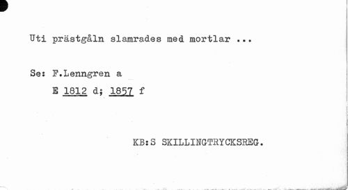 //// Uti prästgåln slamrades med mortlar ... Se: F.Lenngren a //// B 1812 d? 1857 f //// KB!S SKILLINGTHYCKSBEG. //// ' w *. • /»— J I iii c Sm ////