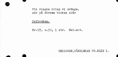 //// Uti ringen kring vi svänga, när på dörren bocken slår //// Julbocken. //// Hr.17, s.32, 1 str. Mel.not. //// HELLGREI,SÅNGLEKAR FR.HAAS I. ////