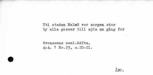 //// Uti staden Malmö var sorgen stor ty alla gossar till sjös en gång for //// v //// 9 //// Svenssons saml.häfte, 4:4. ? Hr.23, s.20-21. //// ÅBO. ////