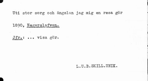 //// Uti stor sorg och ängslan jag mig en resa gör //// / //// 1890, Negersiafven. //// i ¦ //// Jfr.; ... visa gör. ; //// i //// L.U.B.SKILL.UHIK. //// k ////